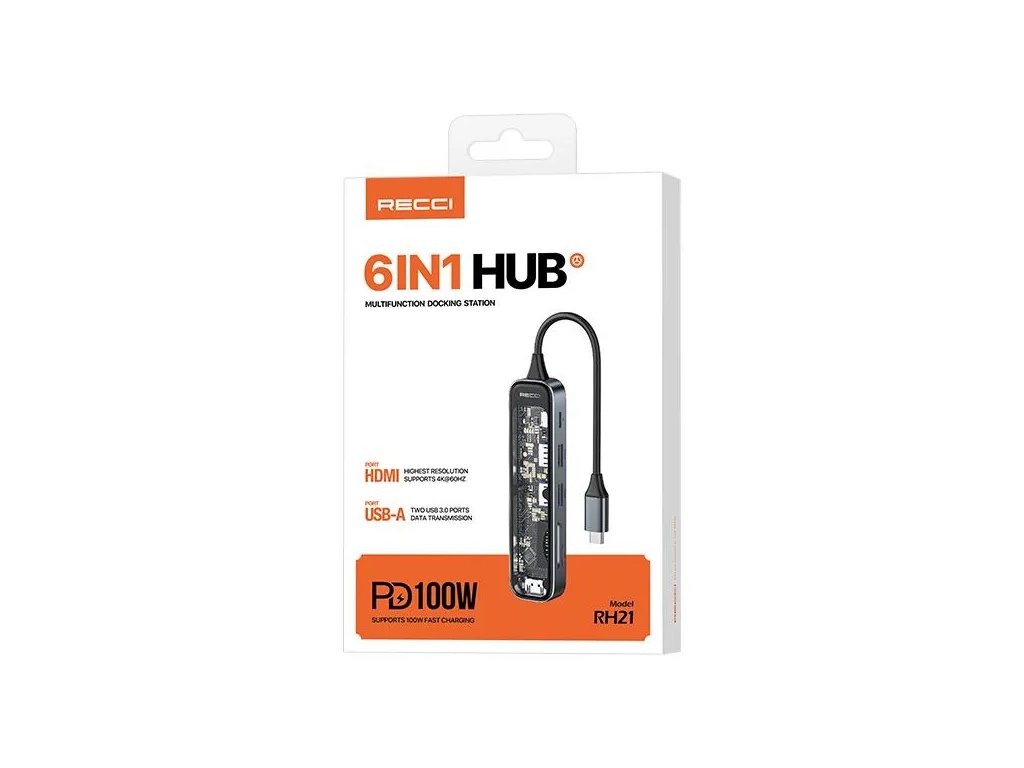 Recci RH21 USB-C hub - 6v1 (USB, HDMI, čtečky karet) Šedá